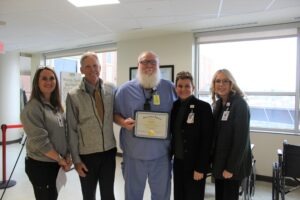 Another nomination said, “On one particular occasion, he found a patient that was very sad and often in tears. The patient had been going through a hard experience and had had many rough times in her life. She had mentioned to her nurse that she just needed something to hug. He took it upon himself to go to the gift shop and purchase her a stuffed animal. She was so thrilled and hugged the animal all night long and didn’t cry. She stated every time she hugged the animal it made her feel better and that she was going to be ok.”